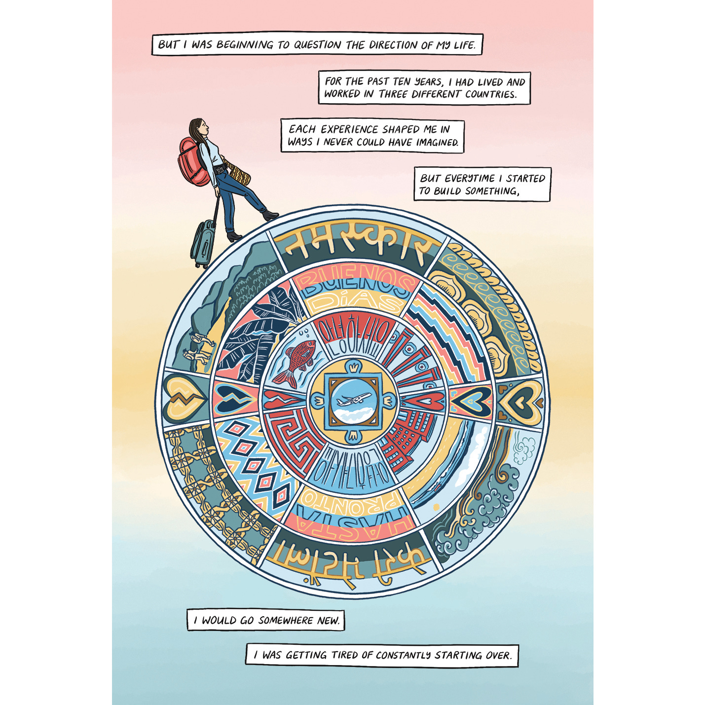 There are three rings representing the countries where I spent ten years of my life: Nepal, Colombia, and Korea. The combination of these rings expresses the cyclical nature of time and repetitive experiences, including learning languages, adapting to culture, love, heartbreak, and saying goodbye. This format also allowed me to summarize ten years of my life on a single page. Of course, a lot happened in those years, but within this one page, the reader has enough information to understand my character’s emotional state. Timing is so important in comics, and I’ve been challenging myself to condense content into short sequences without losing the impact of that moment in the narrative.