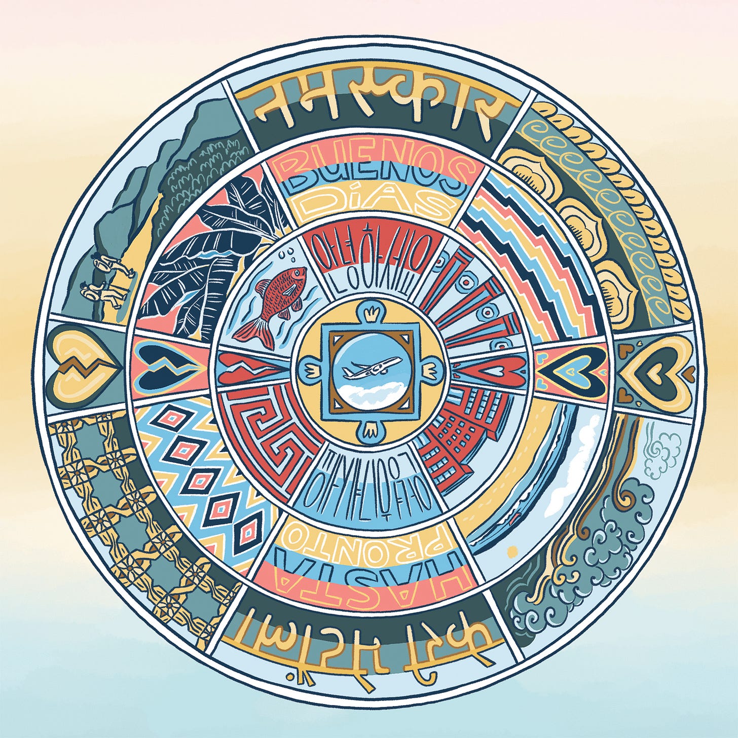 At this point in the narrative, I was living in Kathmandu, Nepal, surrounded by ancient temples and Thangka paintings. I decided that it would be fitting to format these panels within a mandala-inspired motif.